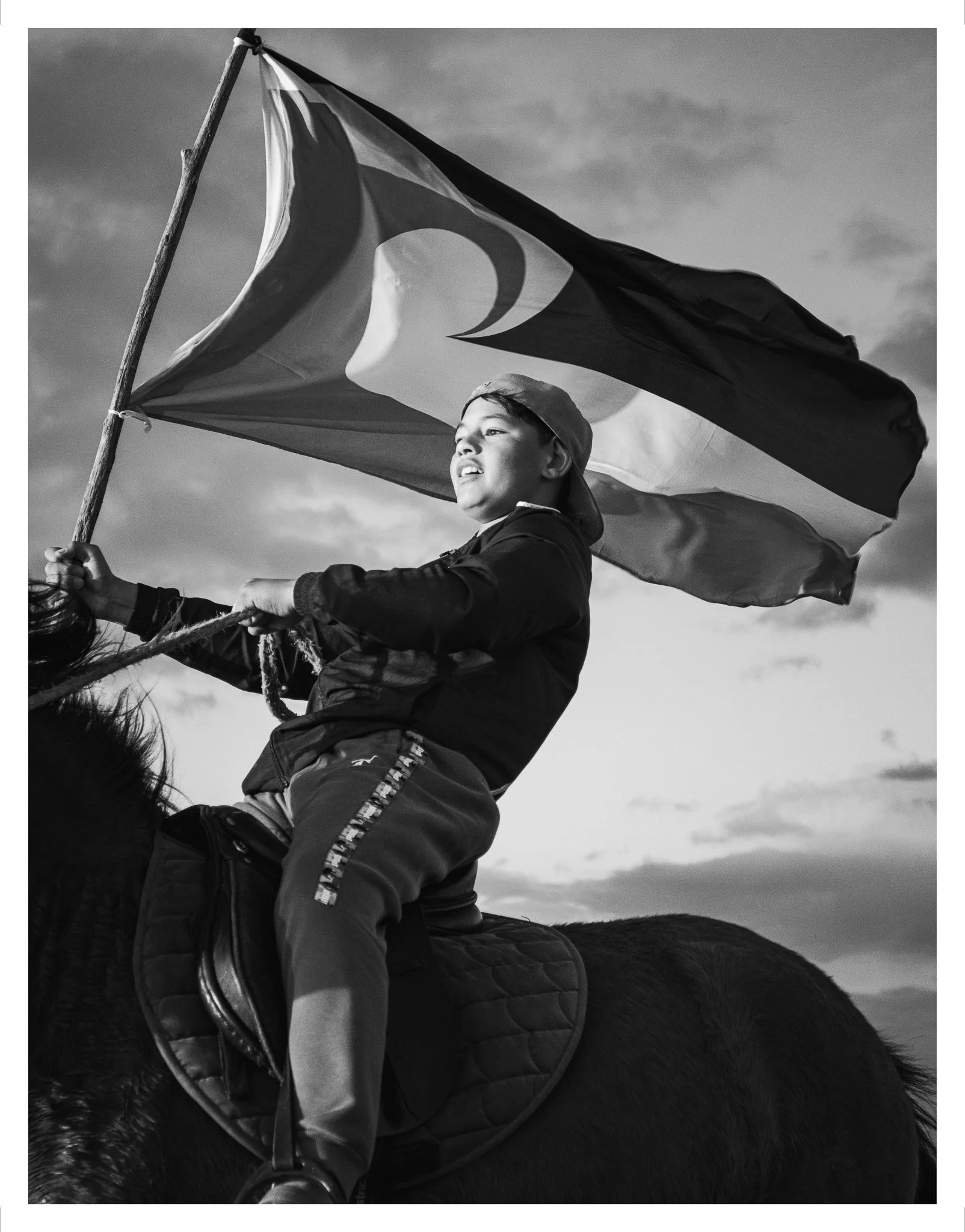 The young rider, his galloping horse, the raised flag, and the brooding land all merge wonderfully to convey this powerful message. The horse—once a symbol of colonization—has been reclaimed as part of our whakapapa and ongoing struggle.